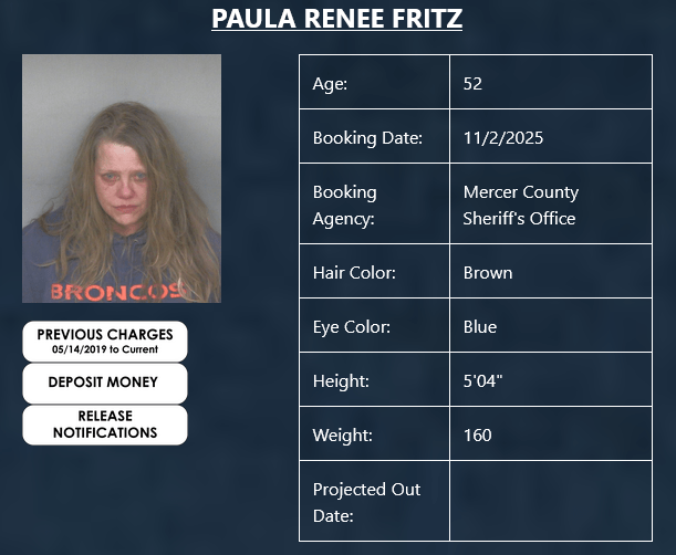 Paula Fritz (52) was booked by the Mercer County Sheriff’s Department on a 4th degree misdemeanor of disorderly conduct persistent.