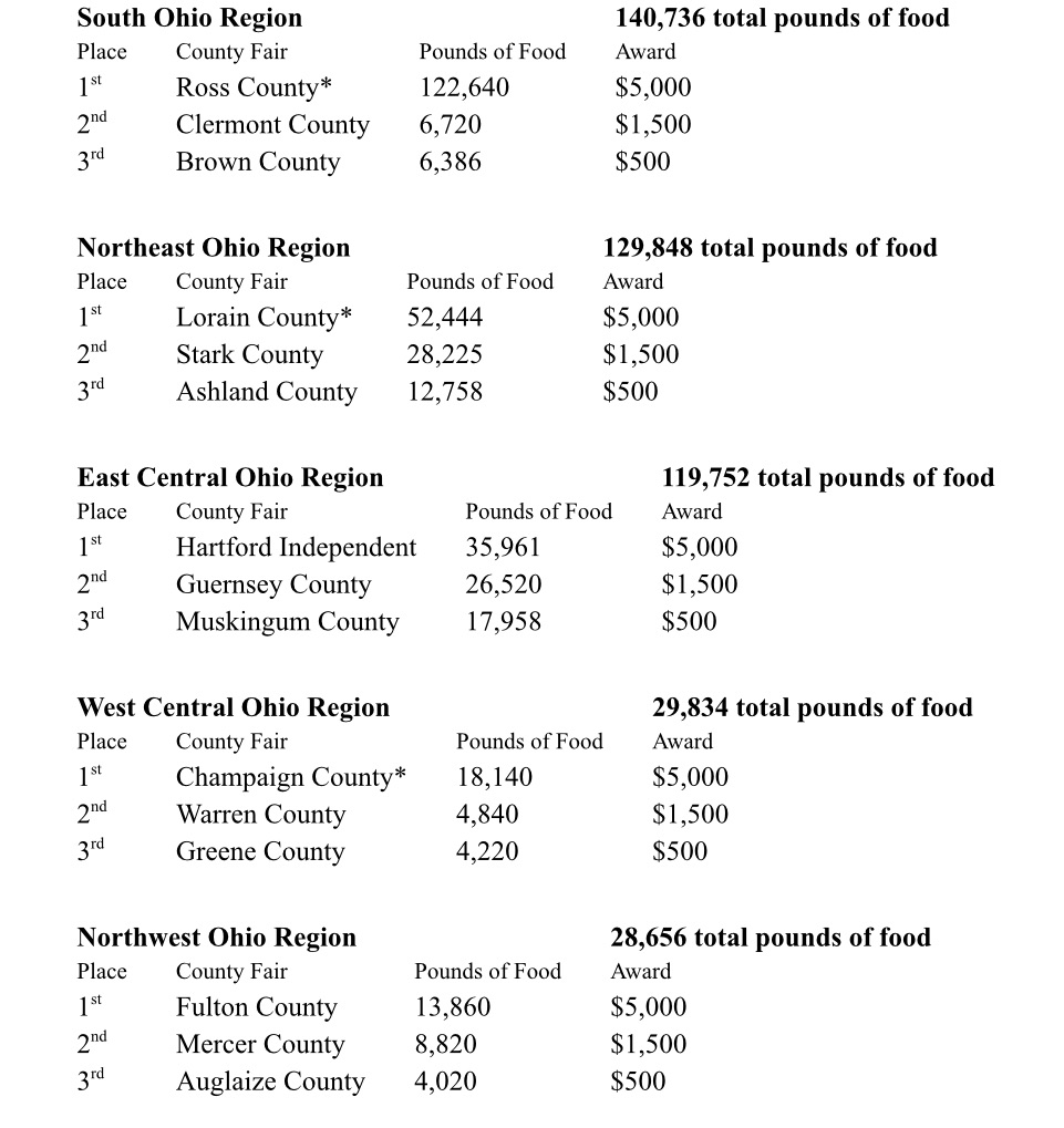 In addition to the nearly 450,000 pounds of food collected by the 4-H teams, Farm Credit Mid-America donated $63,000 to 4-H county fairs in Ohio this summer. All of the nearly 60participating county fair’s 4-H program received a $500 donation to support activities that build future agriculture leaders. Additional prize dollars were given to the top participating fairs in each of five regions.