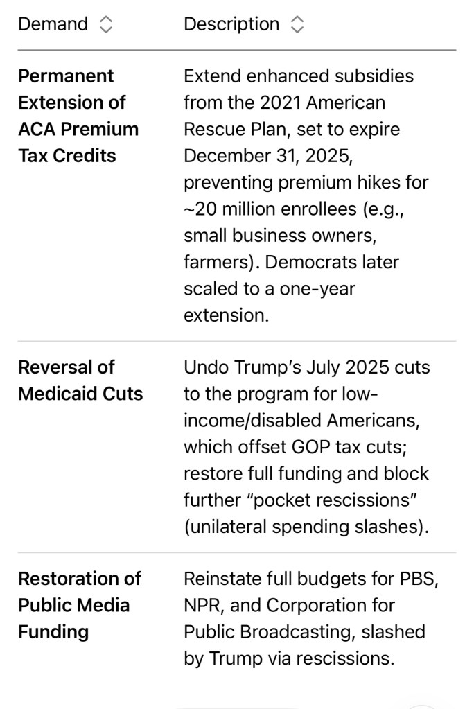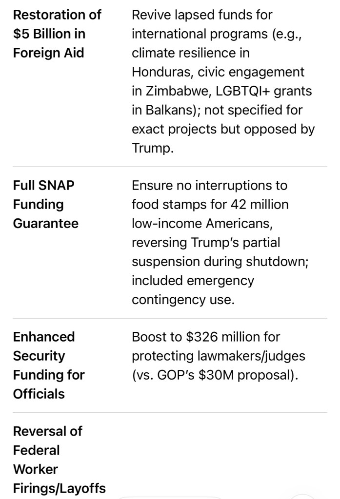 The agreement largely aligns with Republican demands for a “clean” extension of current funding levels but includes targeted Democratic concessions on worker protections and a future vote on health subsidies. It does not include permanent extensions of ACA premium tax credits or reversals of broader Trump-era cuts (e.g., Medicaid), which were Democratic priorities.