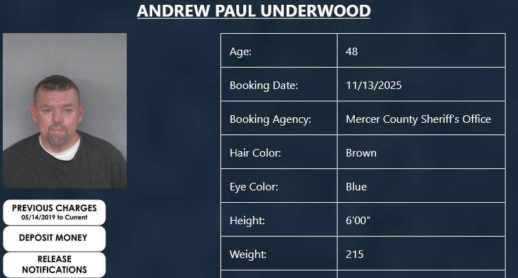 Underwood is being held in the Mercer County Adult Detention Center with no bond awaiting a Mercer County Common Pleas Court hearing.