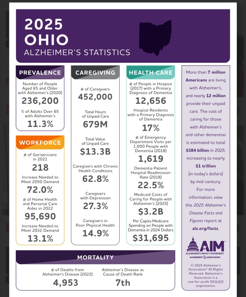 For the first time, the number of people living with Alzheimer’s disease in the U.S. is more than 7 million, including 236,200 in Ohio. Deaths due to Alzheimer’s increased by 142% between 2000 and 2022, while deaths from the leading cause of mortality (heart disease) decreased by 2.1%.