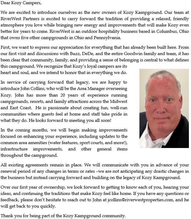 (11-15-25) This last week it was announced that Kozy Kampground (5134 IT IT’S RD) had been sold to an investment group from Columbus – RiverWest Partners.