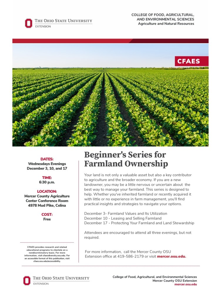 Celina (11-19-25) – Ohio State University Extension Mercer County is hosting a series to assist area residents who would like to learn strategies and best management practices for farmland. The series is designed for those who recently acquired or inherited farmland and have little to no experience with farm or land management.
