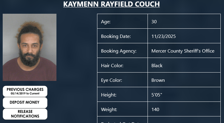 (11-23-25) Kaymenn Couch (30) of Celina was arrested by the Mercer County Sheriff’s Office on a 1st degree misdemeanor of domestic violence.