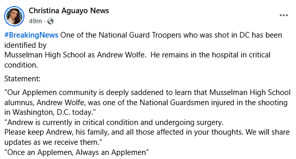 The attack occurred near 17th and I Street NW. Officials described it as a “targeted shooting” where the assailant “came around the corner” and immediately opened fire with a handgun. The suspect was subdued by other National Guard members and taken into custody. He is also hospitalized after being shot during the incident.