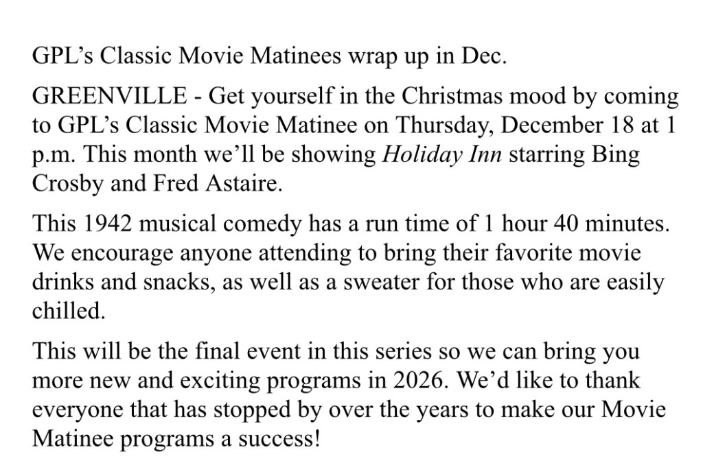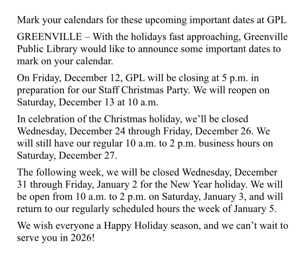 Entertainment, local news, Regional, Uncategorized Greenville Public Library December Calendar Of Events Date: November 28, 2025Author: statelinesportsnetwork 0 Comments (11-28-25) A busy December at the Greenville Public Library during the Holiday Season. Share this: Click to share on X (Opens in new window) X Click to share on Facebook (Opens in new window) Facebook Like Loading... Related
