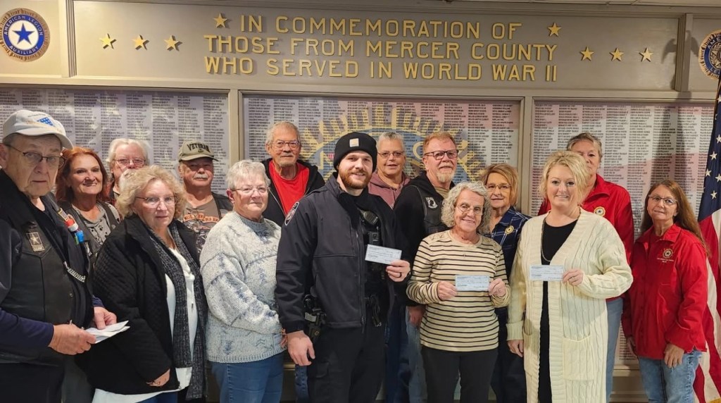 (12-2-25) Patrolman Connor Burr recently represented the Celina Police Department and the Grand Lake Law Enforcement Association with receiving a donation from the Celina American Legion Riders of Post 210 to the Shop with a Cop program.