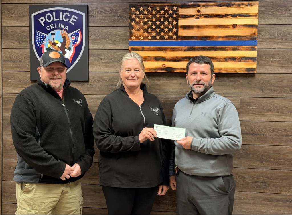 Pictured with Celina Police Chief Wale is Traci Willwrath and Rich McNaughton, members of the Celina Eagles Grand Lake Aerie 1291 presenting a check for $5,000.00 to go towards the Shop With A Cop Program.