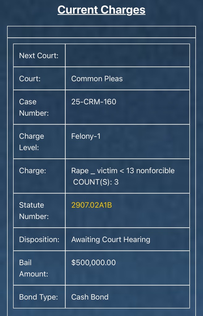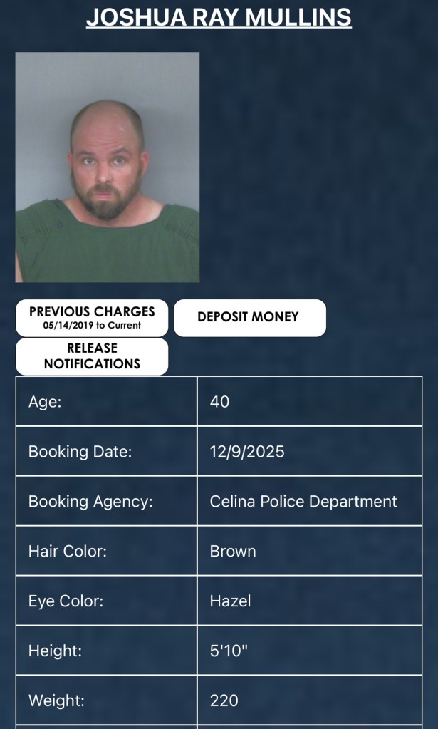 (12-9-25) The Celina Police Department arrested Joshua Ray Mullins (40) on three counts of 1st degree non-forcible rape involving a victim under the age of 13.