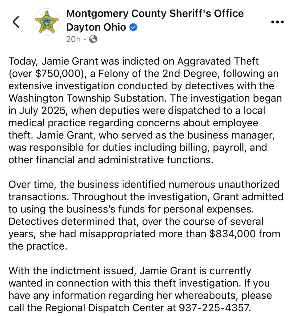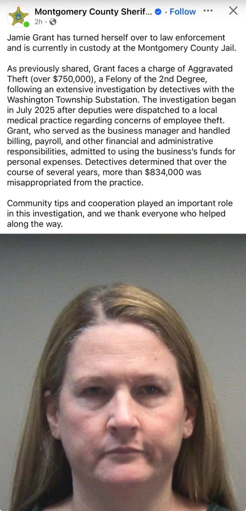 The charge stems from an investigation that began in July 2025, when the Montgomery County Sheriff’s Office was called out to a local medical practice regarding concerns about employee theft, Grant worked as the practice’s business manager and was responsible for duties such as billing and payroll.