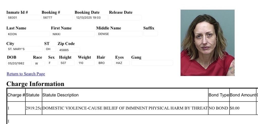 (12-14-25) Nikki Koon (43) of St. Marys was booked on a domestic violence charge.