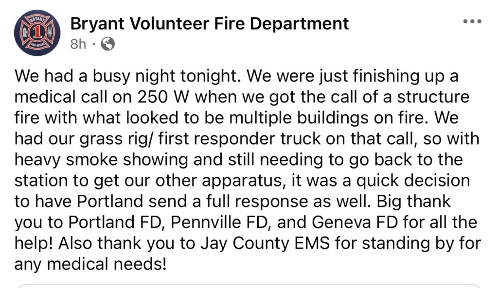 (12-15-25) At approximately 5:26 p.m. Sunday evening, the Portland Fire Department was requested to assist the Bryant Volunteer Fire Department with a working structure fire in the 1000 block of West 400 North. Engine 43 and Tanker 45 responded, along with a total of 17 personnel.