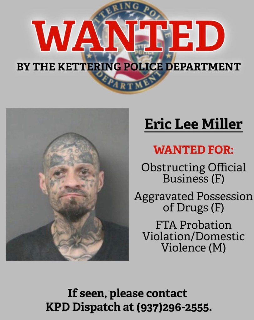 (12-17-25) The Kettering Police Department is looking for Eric Lee Miller, who has felony warrants for Obstructing Official Business and Aggravated Possession of Drugs, and a misdemeanor warrant for FTA Probation Violation/Domestic Violence.