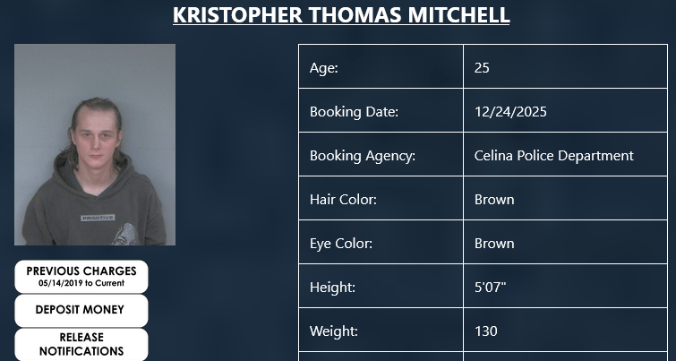 (12-24-25) Kristopher Mitchell (25) of Celina was booked by the Celina Police Department on a 1st degree misdemeanor domestic violence charge and a 3rd degree misdemeanor charge of unlawful restraint.