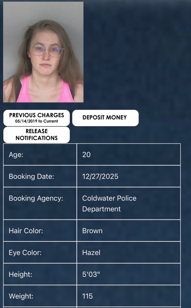 Elise Byron (20) of Coldwater was booked by the Coldwater Police Department on a 4th degree misdemeanor of domestic violence.