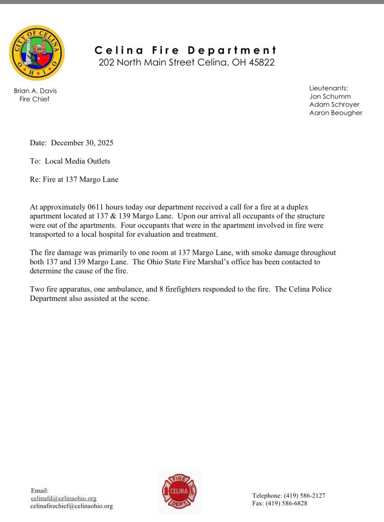 (12-30-25) The Celina Fire Department responded to a fire this morning on the west side of Celina on Margo Lane.