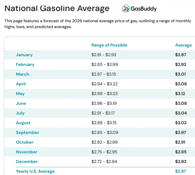 (1-7-26) GasBuddy®, North America’s trusted source for fuel savings for more than 25 years, today released its 2026 Fuel Price Outlook, forecasting the yearly national average price of gasoline to fall back below $3 per gallon for the first time since the COVID-19 pandemic. The yearly U.S. average is projected to be $2.97 per gallon, down 13 cents from 2025’s average of $3.102 and marking the lowest yearly average since 2020.