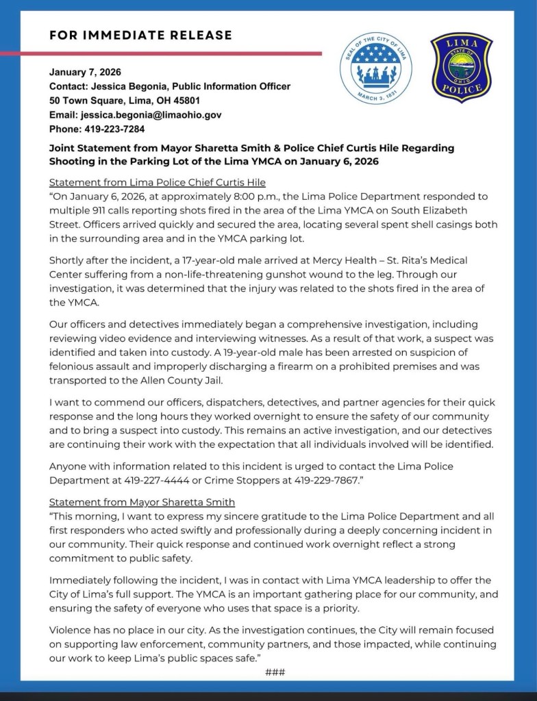 (1-7-26) The City of Lima has released a joint statement from Mayor Sharetta Smith and Lima Police Chief Curtis Hile regarding last night’s shooting in the area of the Lima YMCA.