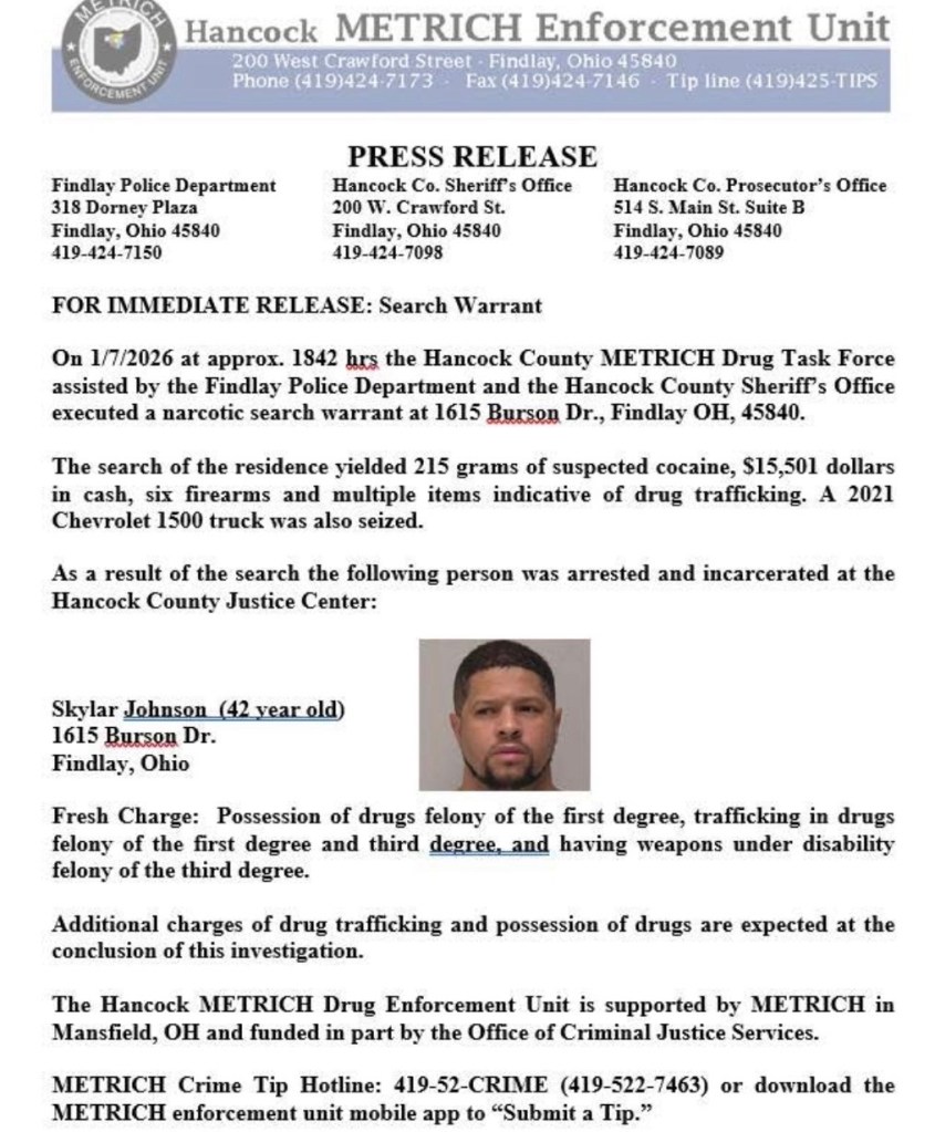 On 1/7/2026 at approx. 6:42pm the Hancock County METRICH Drug Task Force assisted by the Findlay Police Department and the Hancock County Sheriff’s Office executed a narcotic search warrant at 1615 Burson Dr., Findlay OH, 45840.