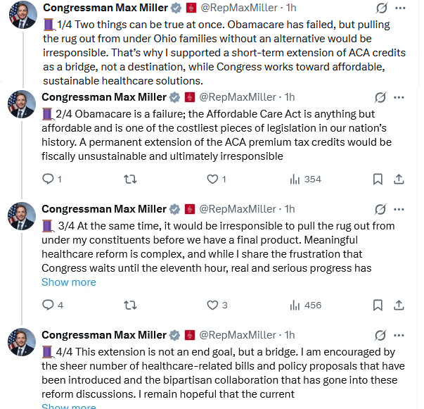 “I voted today to extend the enhanced tax credits for ACA plans. The cost of health care is still too high because of the failed Obamacare policies that removed choice and raised premiums with punishing government mandates on our working families. Close to 45,000 Ohioans in our district currently have these plans, and I want to make sure that they do not lose access to a plan that they have relied on as Congress continues addressing the high cost of health care.