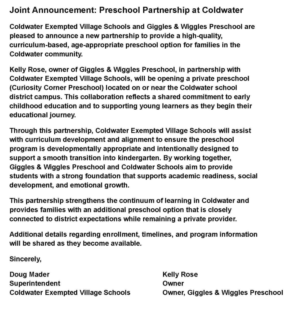 (1-11-26) In a ‘X’ posting today Coldwater Schools Superintendent Doug Mader announced a new preschool partnership with Giggles & Wiggles Preschool which is presently located in Coldwater at 820 East Main St.