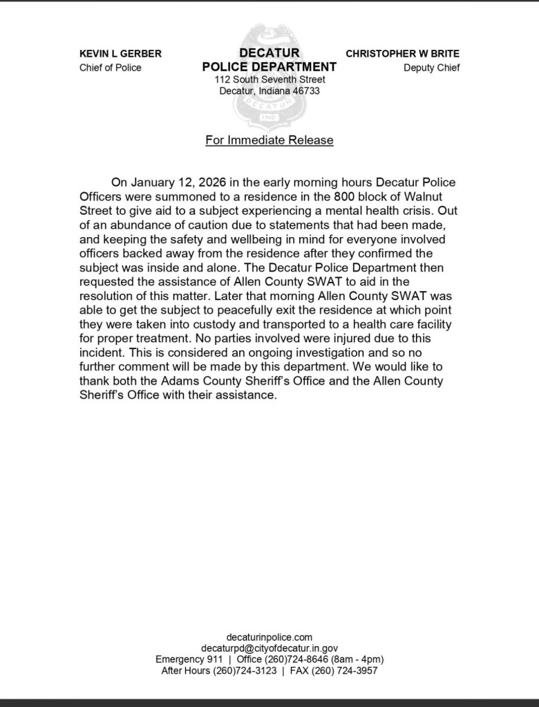(1-12-26) Decatur Police called for assistance from the Allen County SWAT teamthis morning with a subject experiencing a mental health issue in 800 bock of Walnut Street.