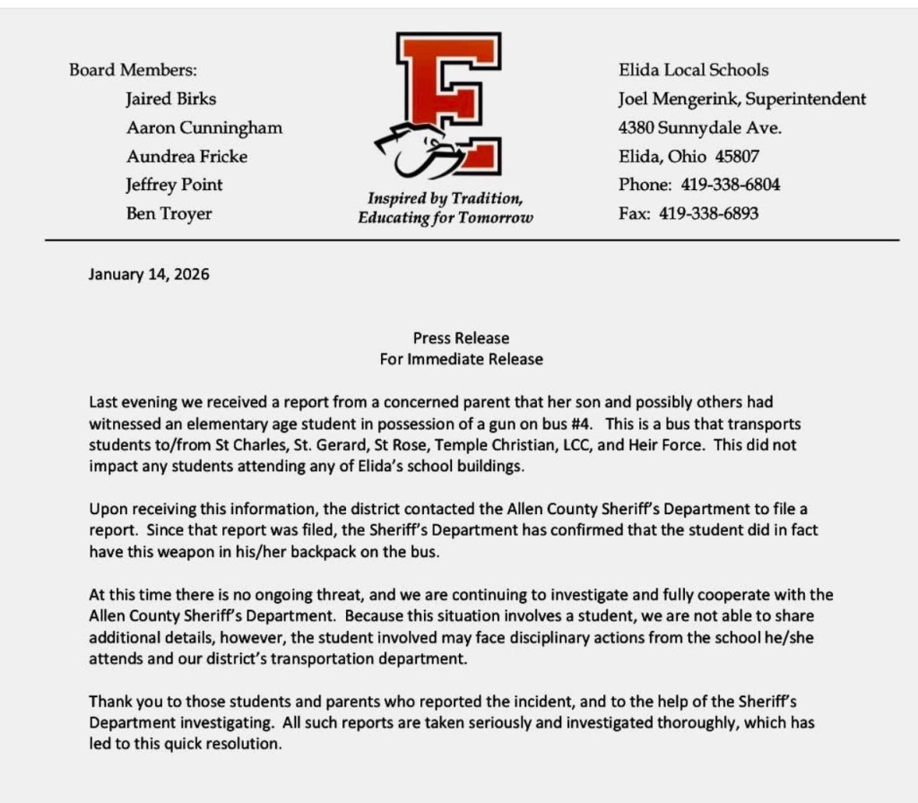 (1-14-26) On January 13, 2026, at approximately 5:45 p.m., the Allen County Sheriff’s Office received a call from the Elida Local School District regarding an elementary student who had reportedly been in possession of a firearm earlier that day while on a school bus. Deputies responded and made contact with the 8-year-old student involved, the student’s parent or guardian, and school officials. The school that the child attended notified parents of the incident.