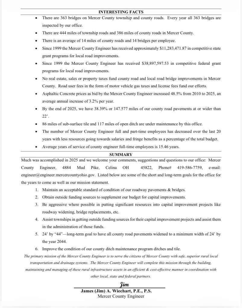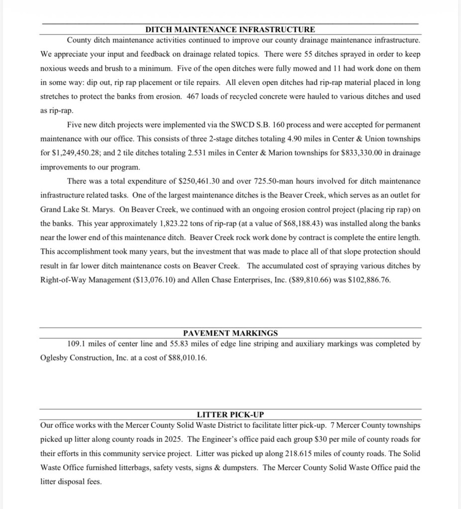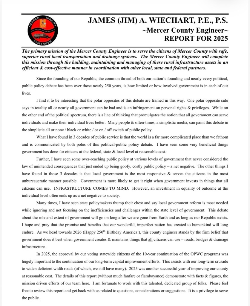 Community, local news, Uncategorized Mercer County Engineer 2025 Annual Report Date: January 14, 2026Author: statelinesportsnetwork 0 Comments (1-14-26) Mercer County Engineer Jim Wiechart released this year’s Annual Report. Share this: Click to share on X (Opens in new window) X Click to share on Facebook (Opens in new window) Facebook Like Loading... Related