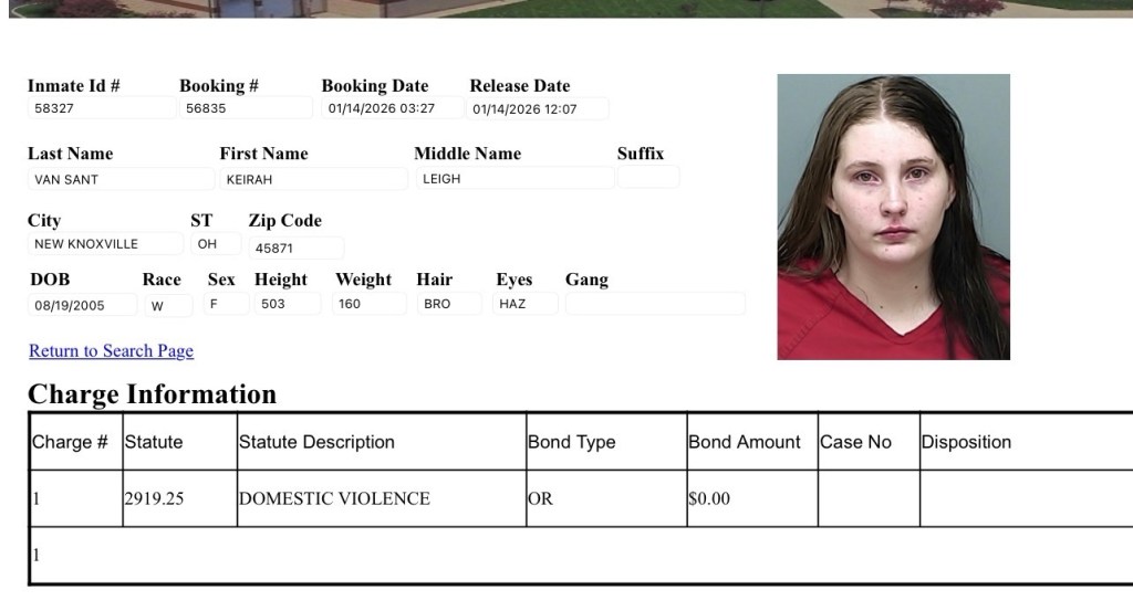 Keirah Van Zant (20) was booked on a domestic violence charge. She is being held in the Auglaize County Jail.