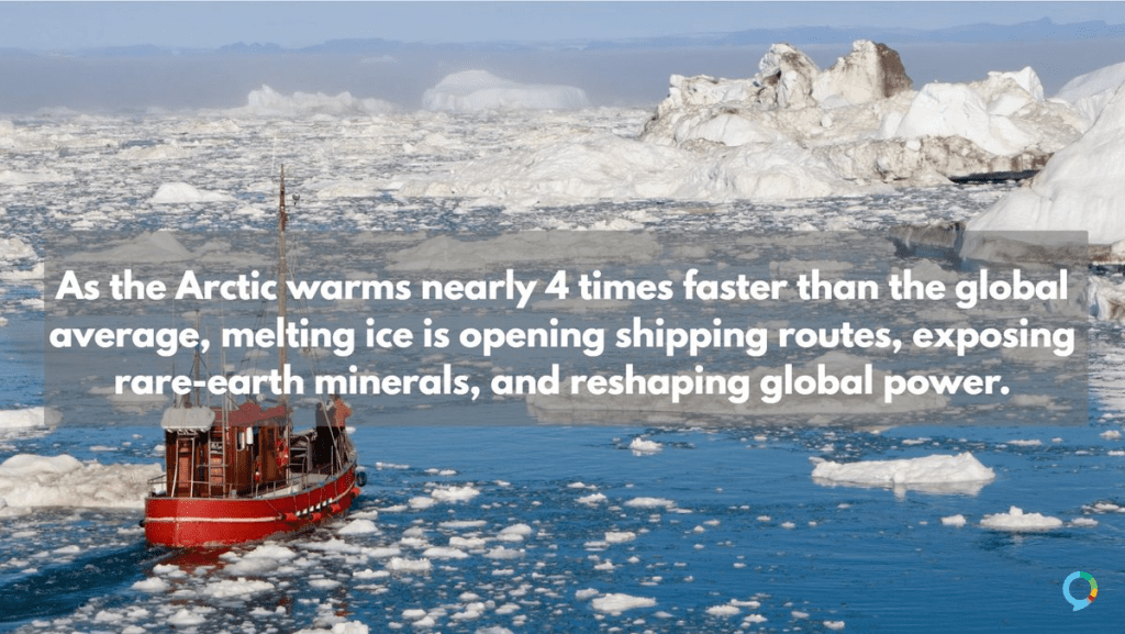 As the Arctic warms rapidly (nearly 4x faster than the global average), new shipping routes (like the Northwest Passage) and military opportunities emerge, heightening competition with Russia and China. Melting ice makes these routes more accessible: