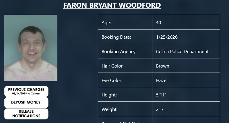 (1-26-26) Faron Woodford (40) of Celina was arrested by the Celina Police on a 1st degree misdemeanor of domestic violence and a 4th degree misdemeanor of failure to disclose personal information.