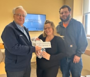 Pictured: Joe Kuebler with the Knights of Columbus, Madilynn and Luke Albers with their newborn baby at the Grand Lake Birthing Center.