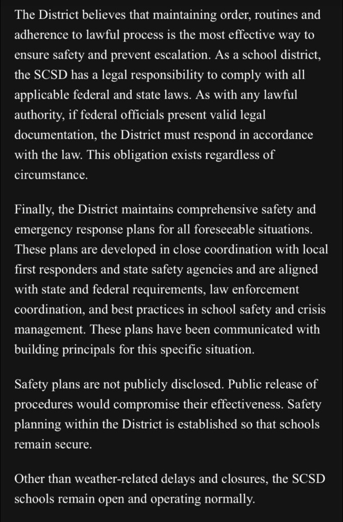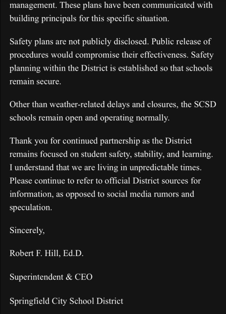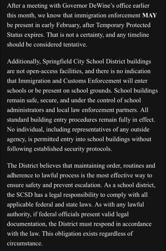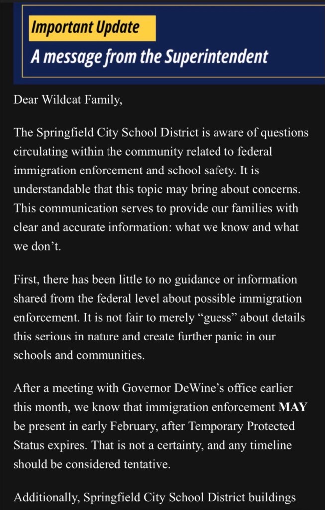 (1-30-26) An update on the Springfield, Ohio City Schools from Superintendent Robert Hill informs the community of possible situations regarding ICE enforcement in the coming days.