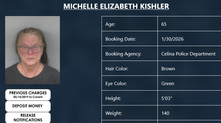 (1-31-26) Michelle Kishler (65) of Celina was booked by the Celina Police on a 1st degree misdemeanor of theft, without consent.