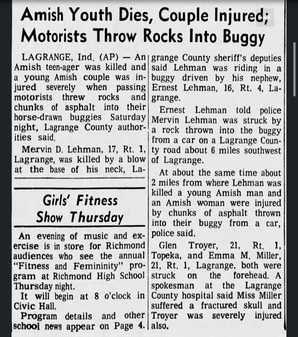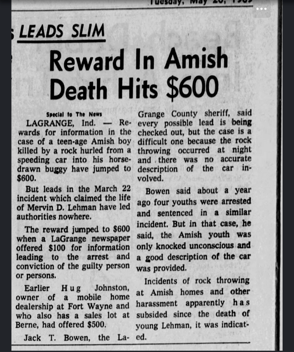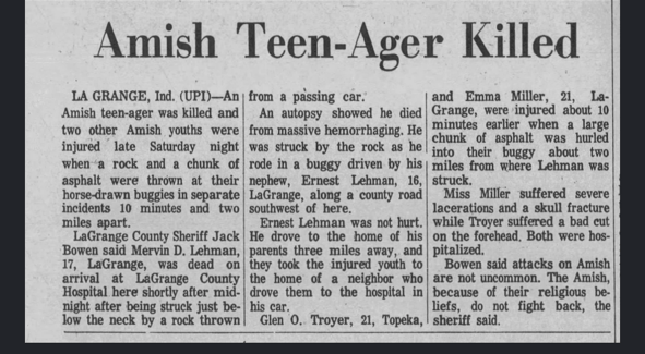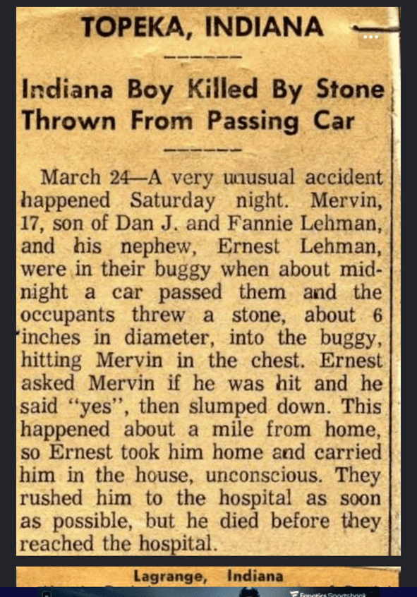 As described in the newspaper articles from the period (attached), the Amish teen was killed by a large rock that was thrown from a passing vehicle. The teen and his nephew were in a horse-drawn buggy on LaGrange County Road 300 West near County Road 350 South around midnight. After the rock hit the victim, they hurried home. A neighbor, who drove, took the injured victim to the hospital. The victim, identified as Mervin Lehman of LaGrange, was pronounced dead at the hospital. A unique fact of this case is that there was another similar incident around the same time, on the same night, about two miles away. Both passengers of this Amish buggy were injured in this seperate incident.
