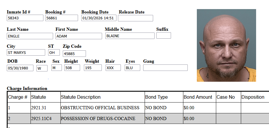 Blaine Engle (44) of St. Marys was booked on a charge of obstructing official business and drug possession -cocaine. He is being held with no bond.