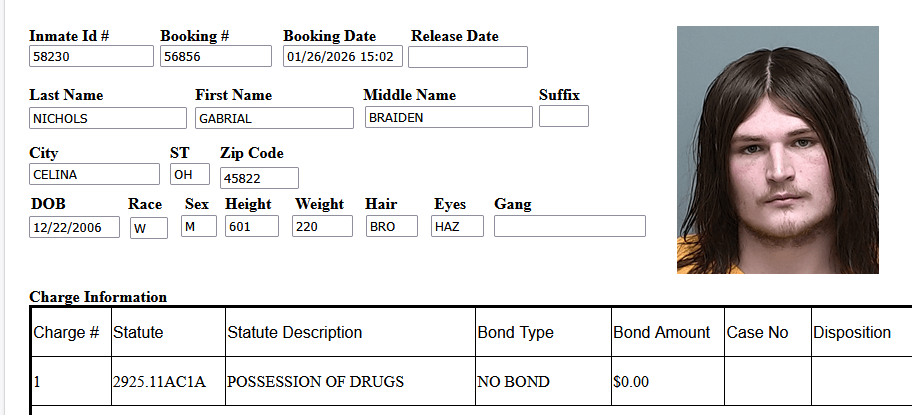 Gabrial Nichols (19) of Celina was booked on a possession of drugs charge and is being held on no bond.