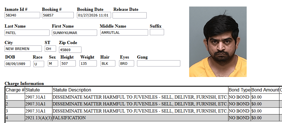 Amrutal Patel (35) of New Bremen was booke on one charge of falsification and three charges of disseminate matter harmful to juveniles, sell deliever or furnish.