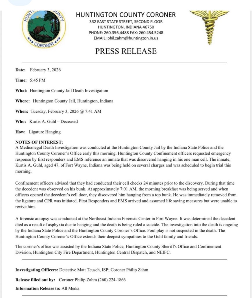 Huntington, IN (2-3-26) – At the request of the Huntington County Sheriff’s Department the Indiana State Police is investigating a death at the Huntington County Jail
