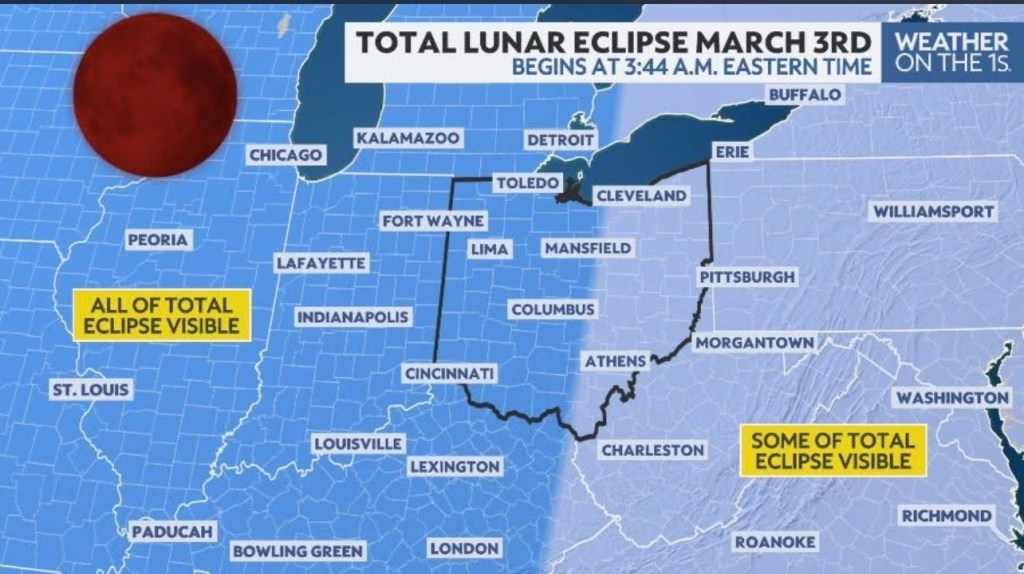 A zoomed in look at how much of the total lunar eclipse/blood moon Ohio and surrounding states will get to see early in the morning on March 3rd.