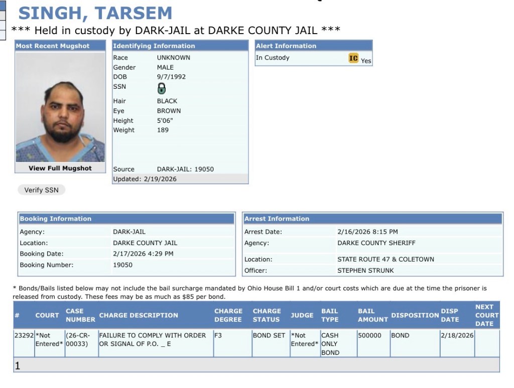 Singh was released from the Miami Valley Hospital and booked on a 3rd degree felony of failure to comply with order or signal of a police officer into the Darke County Jail, where he is being held on a $500,000 cash bond.