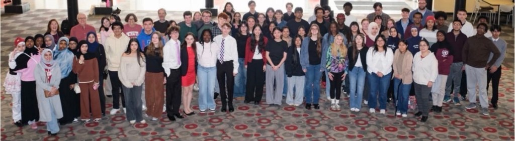 The whole group of participants was photographed by Denis Kelly Jr., World Photography, at the Schwitzer Student Center at UIndy and included students from Brownsburg HS, Carmel HS, Logansport HS, Eman Schools in Fishers, Legacy Learning Center Indianapolis, Coventry Christian HS Indianapolis, and Jay County HS.