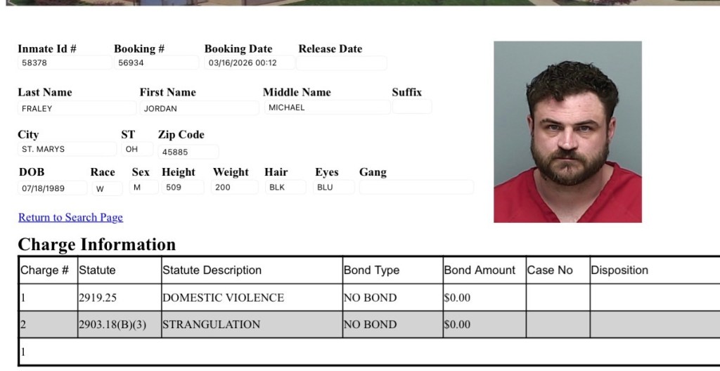 Jordan Fraley (37) of St. Marys on a domestic violence and strangulation charges.