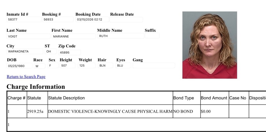 Marianne Voight (46) of Wapakoneta was booked on a domestic violence charge.