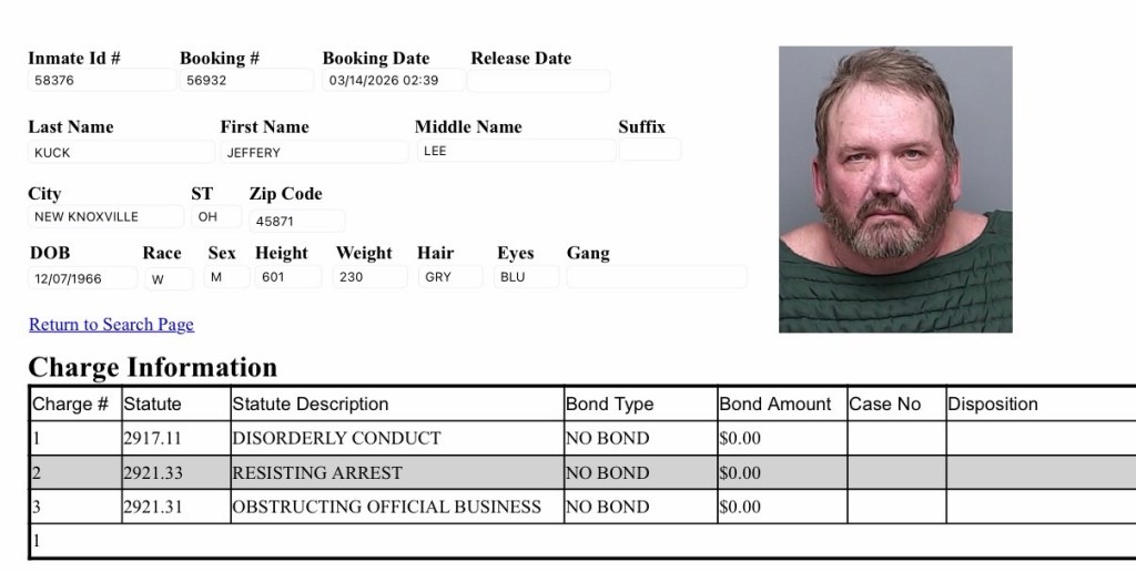 Jeffrey Kuck (59) of New Knoxville was booked on disorderly conduct, resisting arrest and obstructing official business.