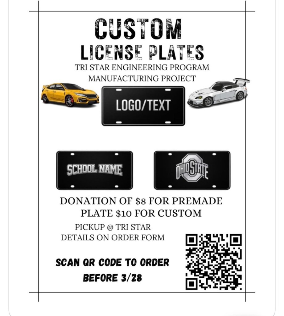 (3-16-26) As part of our Tri Star Engineering “Manufacturing Project,” we are designing and producing custom license plates that you can personalize! This project helps us learn real-world manufacturing skills like design, production, and customer orders.