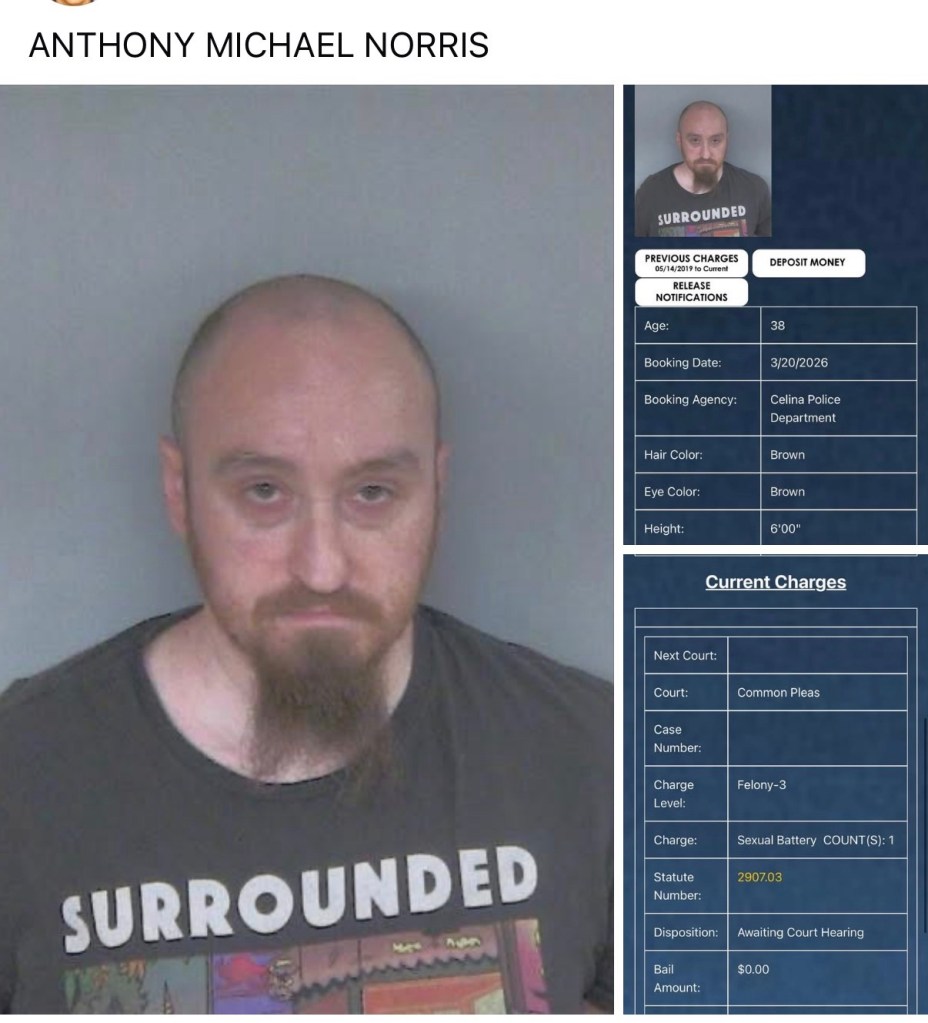 Anthony Norris (38) of Celina was booked by Celina Police on a 3rd degree sexual battery charge.