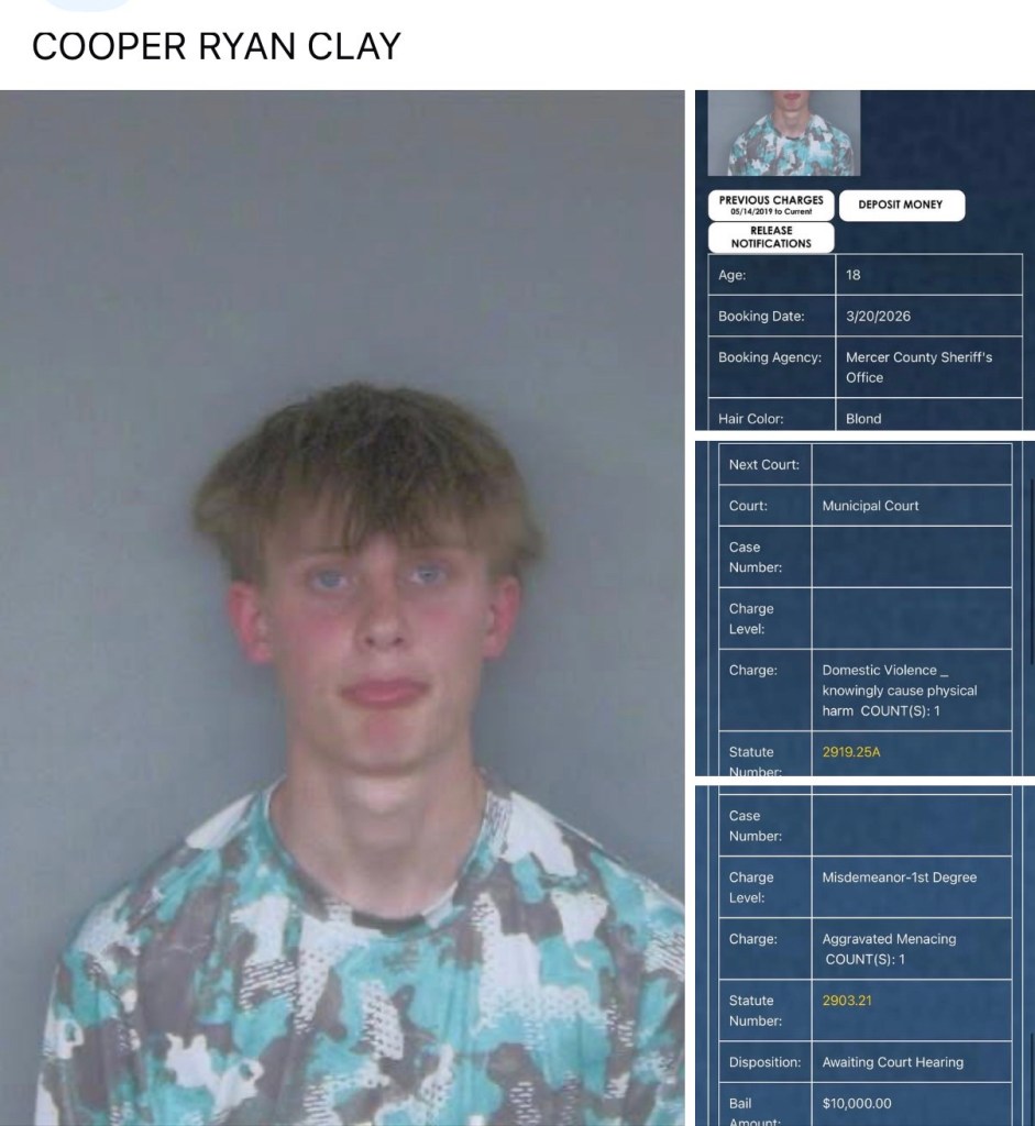 Cooper Clay (18) was booked on two charges by the Mercer County Sheriff’s Office on a domestic violence charge and aggravated menacing. He is being held on $10,000 bond.