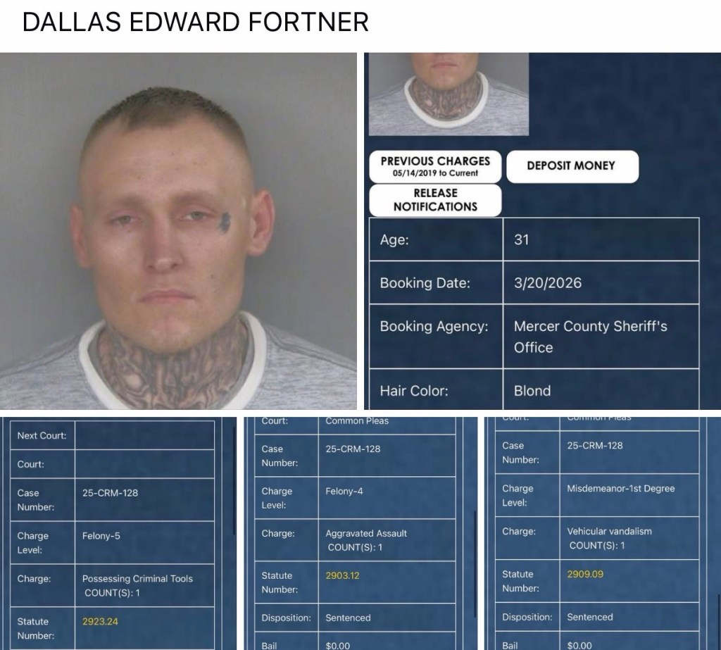 Dallas Fortner (31) was booked by the Mercer County Sheriff’s Office on a 1st degree misdemeanor of vehicular vandalism, a 5th degree felony of possessing criminal tools and a 4th degree felony of aggravated assault. He has been sentenced on the two felony charges.