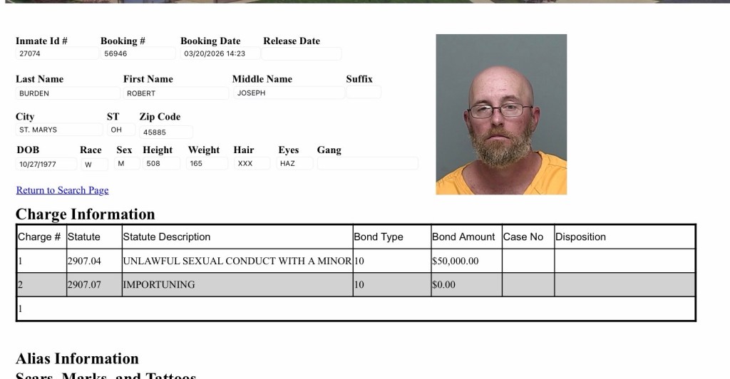 (3-21-26) Robert Burden (48) of St. Marys was booked on unlawful sexual conduct with a minor and importuning.